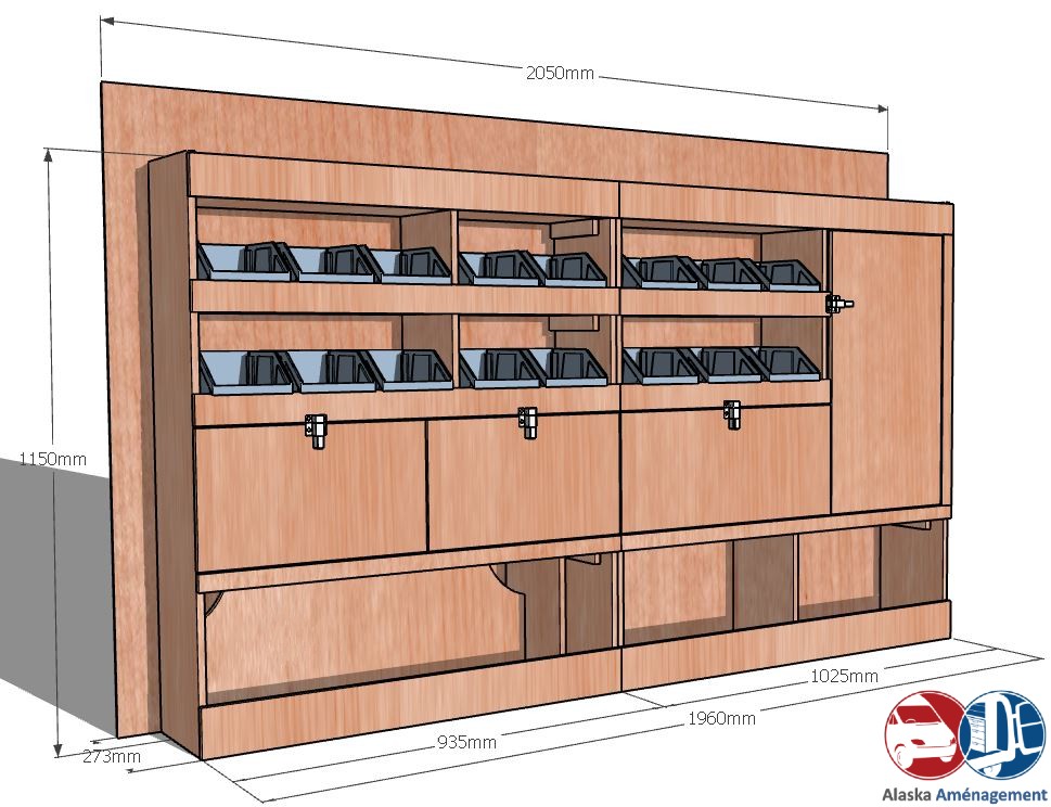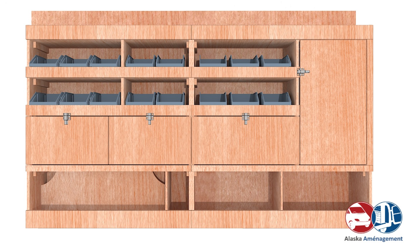 Ce meuble de rangement KRG003-N (pour le latéral « Gauche » de votre véhicule) offre une solution polyvalente avec cinq niveaux de stockage fonctionnels. Il comprend des étagères pour bacs à bec, des clapets basculants et un placard. Une étagère supérieure est conçue pour les objets longs. Son fond arrière intégré assure la rigidité et protège la carrosserie du véhicule, évitant un habillage supplémentaire. Le meuble est disponible en contreplaqué brut ou filmé. |