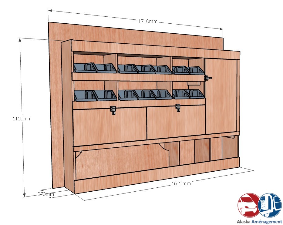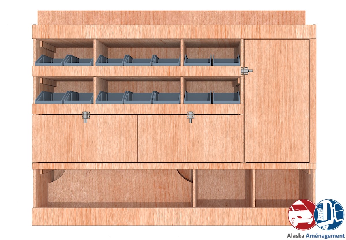 Ce meuble de rangement KRG003-N (pour le latéral « Gauche » de votre véhicule) offre une solution polyvalente avec cinq niveaux de stockage fonctionnels. Il comprend des étagères pour bacs à bec, des clapets basculants et un placard. Une étagère supérieure est conçue pour les objets longs. Son fond arrière intégré assure la rigidité et protège la carrosserie du véhicule, évitant un habillage supplémentaire. Le meuble est disponible en contreplaqué brut ou filmé. |