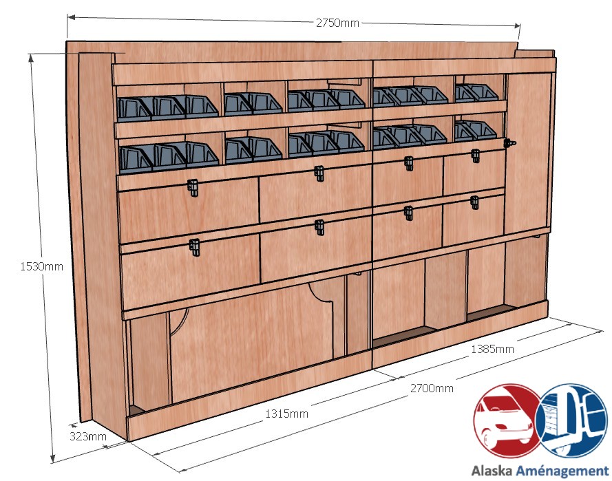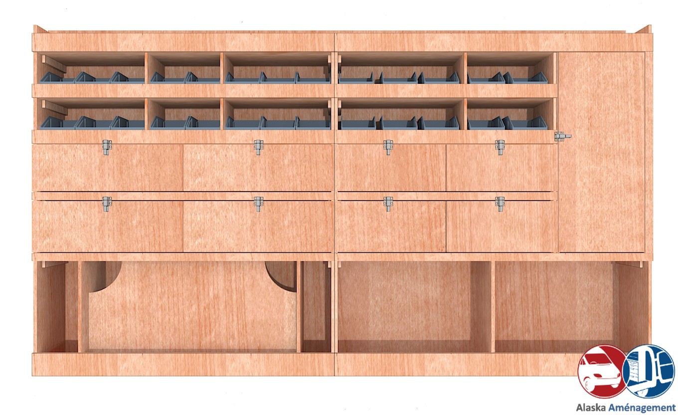 Ce meuble de rangement KRG003-N (pour le latéral « Gauche » de votre véhicule) offre une solution polyvalente avec six niveaux de stockage fonctionnels. Il comprend des étagères pour bacs à bec, des clapets basculants et un placard. Une étagère supérieure est conçue pour les objets longs. Son fond arrière intégré assure la rigidité et protège la carrosserie du véhicule, évitant un habillage supplémentaire. Le meuble est disponible en contreplaqué brut ou filmé. |