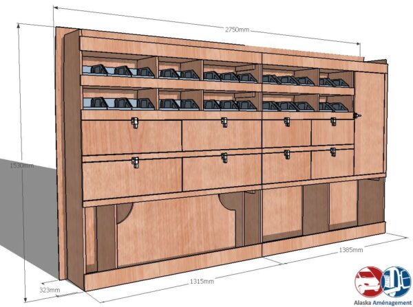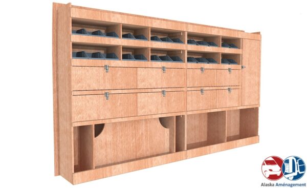 Ce meuble de rangement KRG003-N (pour le latéral « Gauche » de votre véhicule) offre une solution polyvalente avec six niveaux de stockage fonctionnels. Il comprend des étagères pour bacs à bec, des clapets basculants et un placard. Une étagère supérieure est conçue pour les objets longs. Son fond arrière intégré assure la rigidité et protège la carrosserie du véhicule, évitant un habillage supplémentaire. Le meuble est disponible en contreplaqué brut ou filmé.