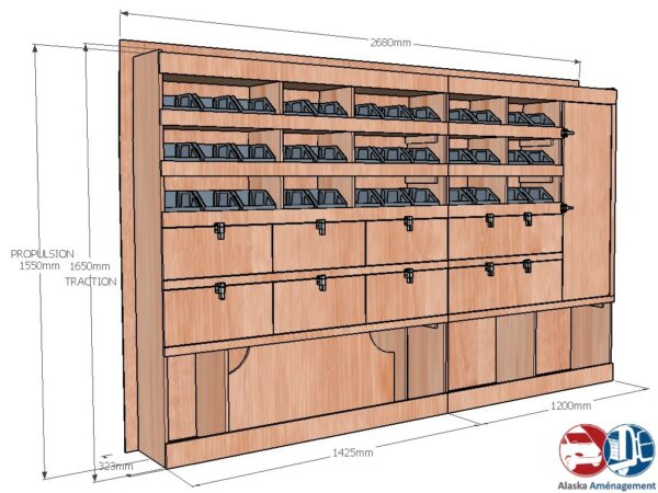 Ce meuble de rangement KRG003-N(pour le latéral « Gauche » de votre véhicule) offre une solution polyvalente avec sept niveaux de stockage fonctionnels. Il comprend des étagères pour bacs à bec, des clapets basculants et un placard. Une étagère supérieure est conçue pour les objets longs. Son fond arrière intégré assure la rigidité et protège la carrosserie du véhicule, évitant un habillage supplémentaire. Le meuble est disponible en contreplaqué brut ou filmé.
