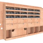 Ce meuble de rangement KRG003-N (pour le latéral « Gauche » de votre véhicule) offre une solution polyvalente avec sept niveaux de stockage fonctionnels. Il comprend des étagères pour bacs à bec, des clapets basculants et un placard. Une étagère supérieure est conçue pour les objets longs. Son fond arrière intégré assure la rigidité et protège la carrosserie du véhicule, évitant un habillage supplémentaire. Le meuble est disponible en contreplaqué brut ou filmé.