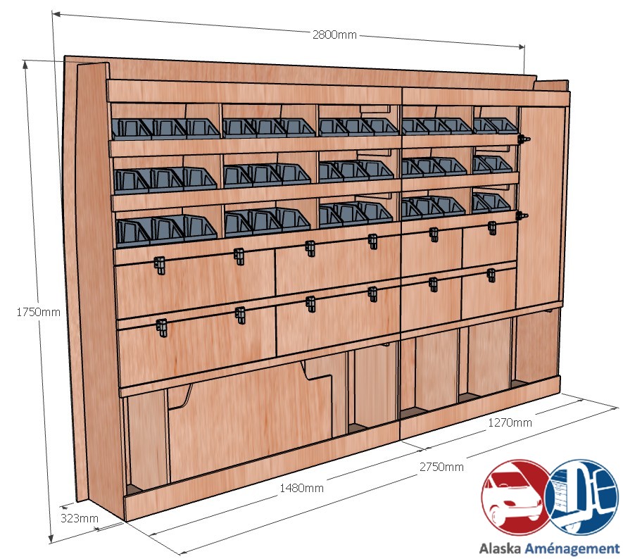 Ce meuble de rangement KRG003-N (pour le latéral « Gauche » de votre véhicule) offre une solution polyvalente avec sept niveaux de stockage fonctionnels. Il comprend des étagères pour bacs à bec, des clapets basculants et un placard. Une étagère supérieure est conçue pour les objets longs. Son fond arrière intégré assure la rigidité et protège la carrosserie du véhicule, évitant un habillage supplémentaire. Le meuble est disponible en contreplaqué brut ou filmé. |