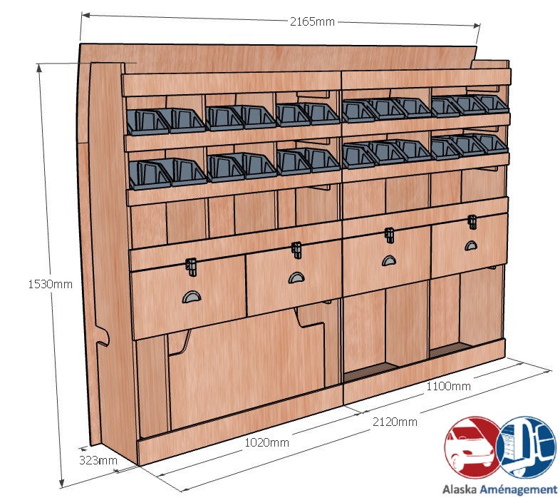 Ce meuble de rangement KRG004-N (pour le latéral « Gauche » de votre véhicule) offre une solution polyvalente et fonctionnelle avec six niveaux de stockage. Il comprend des étagères pour bacs à bec, une rangée de tiroirs. Une étagère supérieure est conçue pour les objets longs. Son fond arrière intégré assure la rigidité et protège la carrosserie du véhicule, évitant un habillage supplémentaire. Le meuble est disponible en contreplaqué brut ou filmé. |
