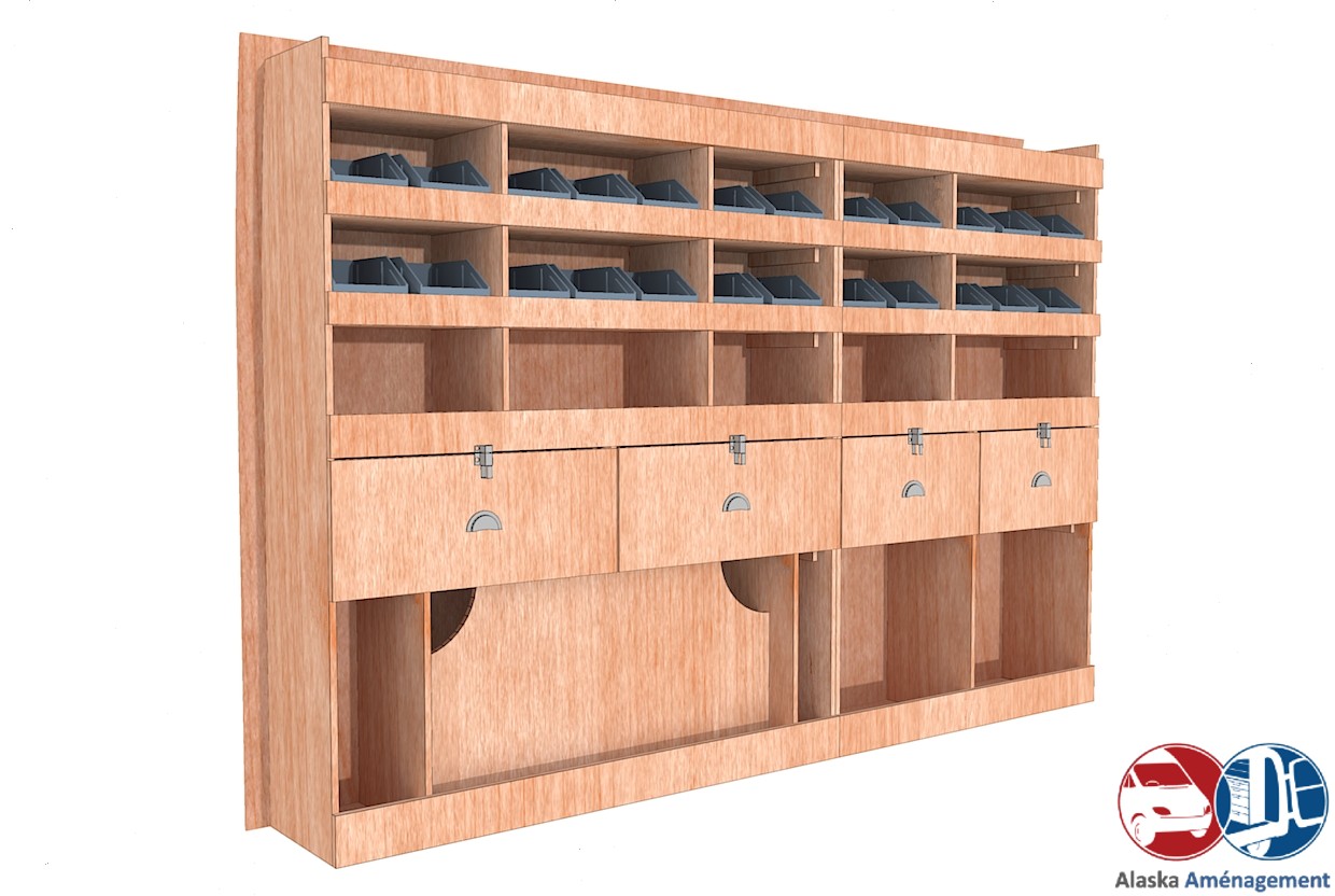 Ce meuble de rangement KRG004-N(pour le latéral « Gauche » de votre véhicule) offre une solution polyvalente et fonctionnelle avec six niveaux de stockage. Il comprend des étagères pour bacs à bec, une rangée de tiroirs. Une étagère supérieure est conçue pour les objets longs. Son fond arrière intégré assure la rigidité et protège la carrosserie du véhicule, évitant un habillage supplémentaire. Le meuble est disponible en contreplaqué brut ou filmé.