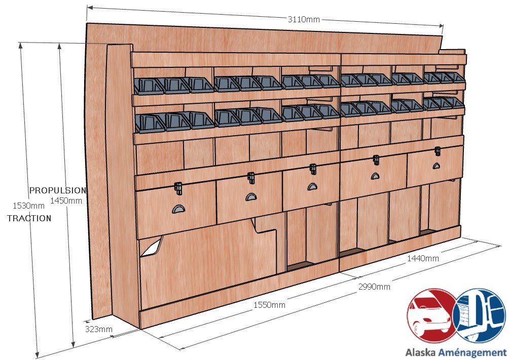Ce meuble de rangement KRG004-N (pour le latéral « Gauche » de votre véhicule) offre une solution polyvalente et fonctionnelle avec six niveaux de stockage. Il comprend des étagères pour bacs à bec, une rangée de tiroirs. Une étagère supérieure est conçue pour les objets longs. Son fond arrière intégré assure la rigidité et protège la carrosserie du véhicule, évitant un habillage supplémentaire. Le meuble est disponible en contreplaqué brut ou filmé. |