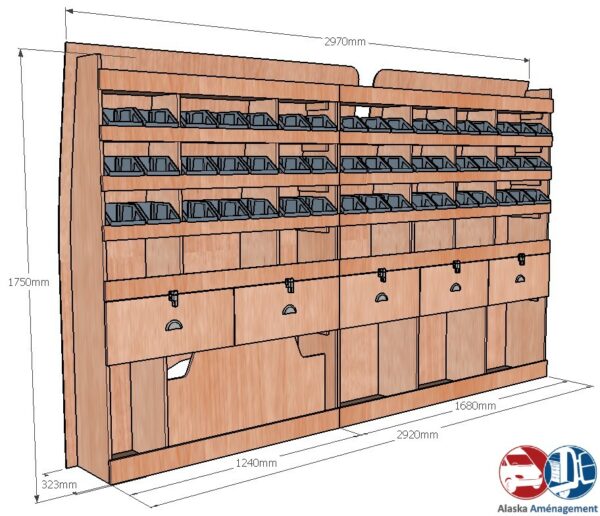 Ce meuble de rangement KRG004-N(pour le latéral « Gauche » de votre véhicule) offre une solution polyvalente et fonctionnelle avec sept niveaux de stockage. Il comprend des étagères pour bacs à bec, une rangée de tiroirs. Une étagère supérieure est conçue pour les objets longs. Son fond arrière intégré assure la rigidité et protège la carrosserie du véhicule, évitant un habillage supplémentaire. Le meuble est disponible en contreplaqué brut ou filmé.
