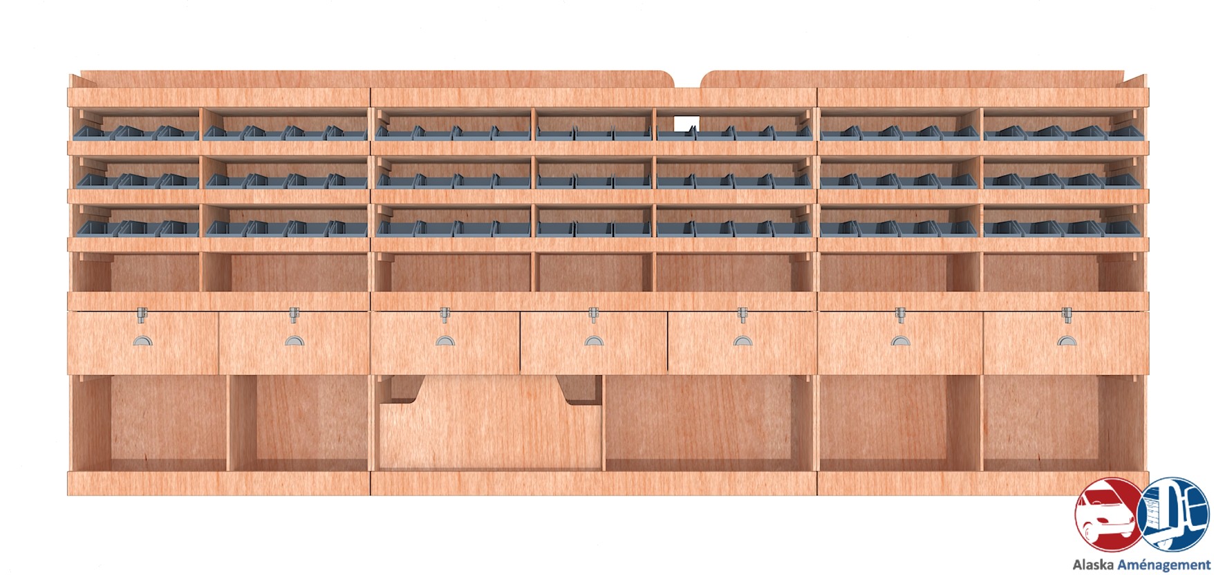 Ce meuble de rangement KRG004-N (pour le latéral « Gauche » de votre véhicule) offre une solution polyvalente et fonctionnelle avec sept niveaux de stockage. Il comprend des étagères pour bacs à bec, une rangée de tiroirs. Une étagère supérieure est conçue pour les objets longs. Son fond arrière intégré assure la rigidité et protège la carrosserie du véhicule, évitant un habillage supplémentaire. Le meuble est disponible en contreplaqué brut ou filmé.