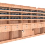 Meuble structuré avec tiroirs, étagères avec bacs à bec, conçu pour un rangement précis et organisé.