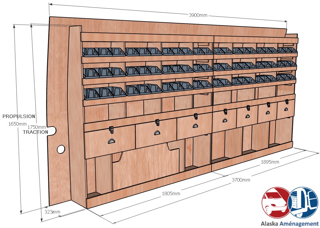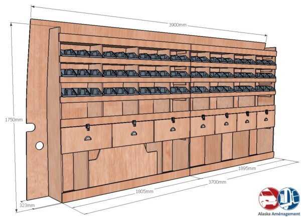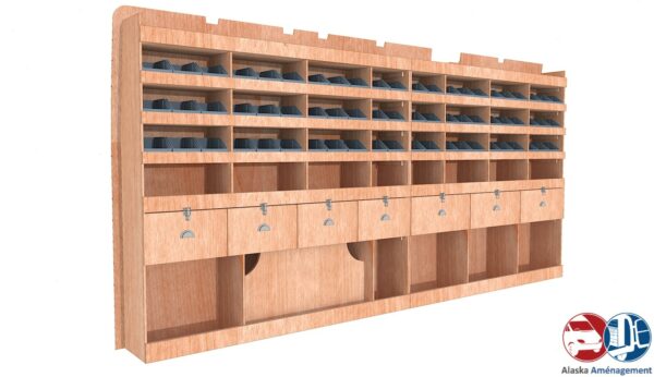 Ce meuble de rangement KRG004-N (pour le latéral « Gauche » de votre véhicule) offre une solution polyvalente et fonctionnelle avec sept niveaux de stockage. Il comprend des étagères pour bacs à bec, une rangée de tiroirs. Une étagère supérieure est conçue pour les objets longs. Son fond arrière intégré assure la rigidité et protège la carrosserie du véhicule, évitant un habillage supplémentaire. Le meuble est disponible en contreplaqué brut ou filmé.