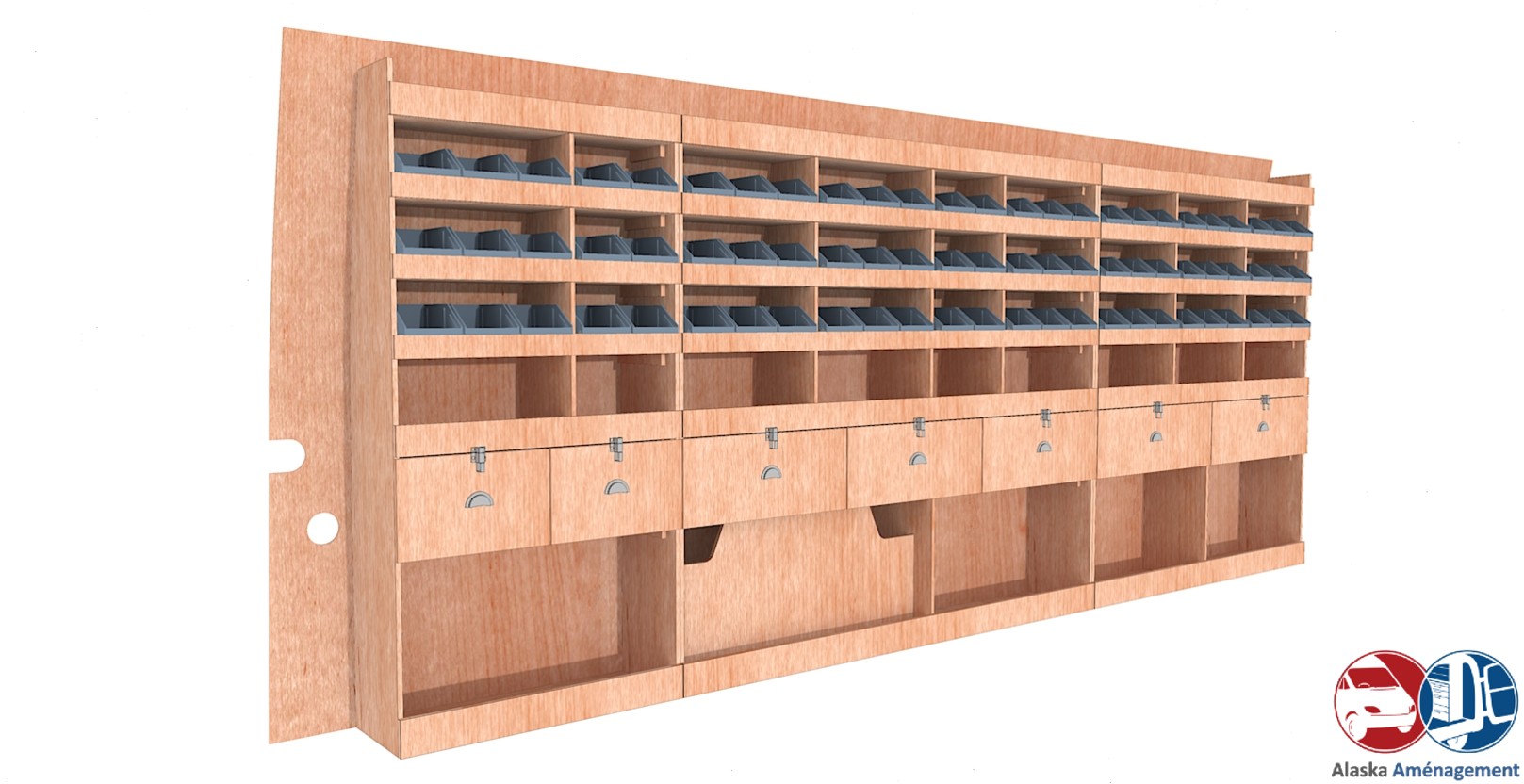 Ce meuble de rangement KRG004-N(pour le latéral « Gauche » de votre véhicule) offre une solution polyvalente et fonctionnelle avec sept niveaux de stockage. Il comprend des étagères pour bacs à bec, une rangée de tiroirs. Une étagère supérieure est conçue pour les objets longs. Son fond arrière intégré assure la rigidité et protège la carrosserie du véhicule, évitant un habillage supplémentaire. Le meuble est disponible en contreplaqué brut ou filmé.