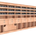 Meuble structuré avec tiroirs, étagères avec bacs à bec, conçu pour un rangement précis et organisé.