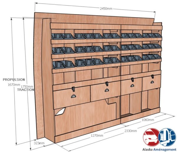 Ce meuble de rangement KRG004-N (pour le latéral « Gauche » de votre véhicule) offre une solution polyvalente et fonctionnelle avec sept niveaux de stockage. Il comprend des étagères pour bacs à bec, une rangée de tiroirs. Une étagère supérieure est conçue pour les objets longs. Son fond arrière intégré assure la rigidité et protège la carrosserie du véhicule, évitant un habillage supplémentaire. Le meuble est disponible en contreplaqué brut ou filmé. |
