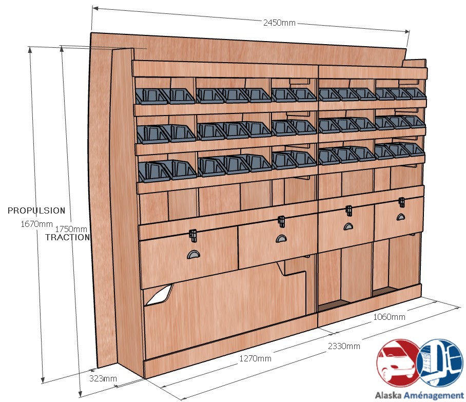 Ce meuble de rangement KRG004-N (pour le latéral « Gauche » de votre véhicule) offre une solution polyvalente et fonctionnelle avec sept niveaux de stockage. Il comprend des étagères pour bacs à bec, une rangée de tiroirs. Une étagère supérieure est conçue pour les objets longs. Son fond arrière intégré assure la rigidité et protège la carrosserie du véhicule, évitant un habillage supplémentaire. Le meuble est disponible en contreplaqué brut ou filmé. |