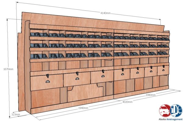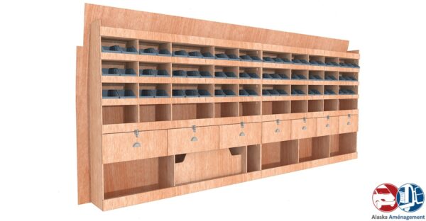 Ce meuble de rangement KRG004-N (pour le latéral « Gauche » de votre véhicule) offre une solution polyvalente et fonctionnelle avec sept niveaux de stockage. Il comprend des étagères pour bacs à bec, une rangée de tiroirs. Une étagère supérieure est conçue pour les objets longs. Son fond arrière intégré assure la rigidité et protège la carrosserie du véhicule, évitant un habillage supplémentaire. Le meuble est disponible en contreplaqué brut ou filmé. |
