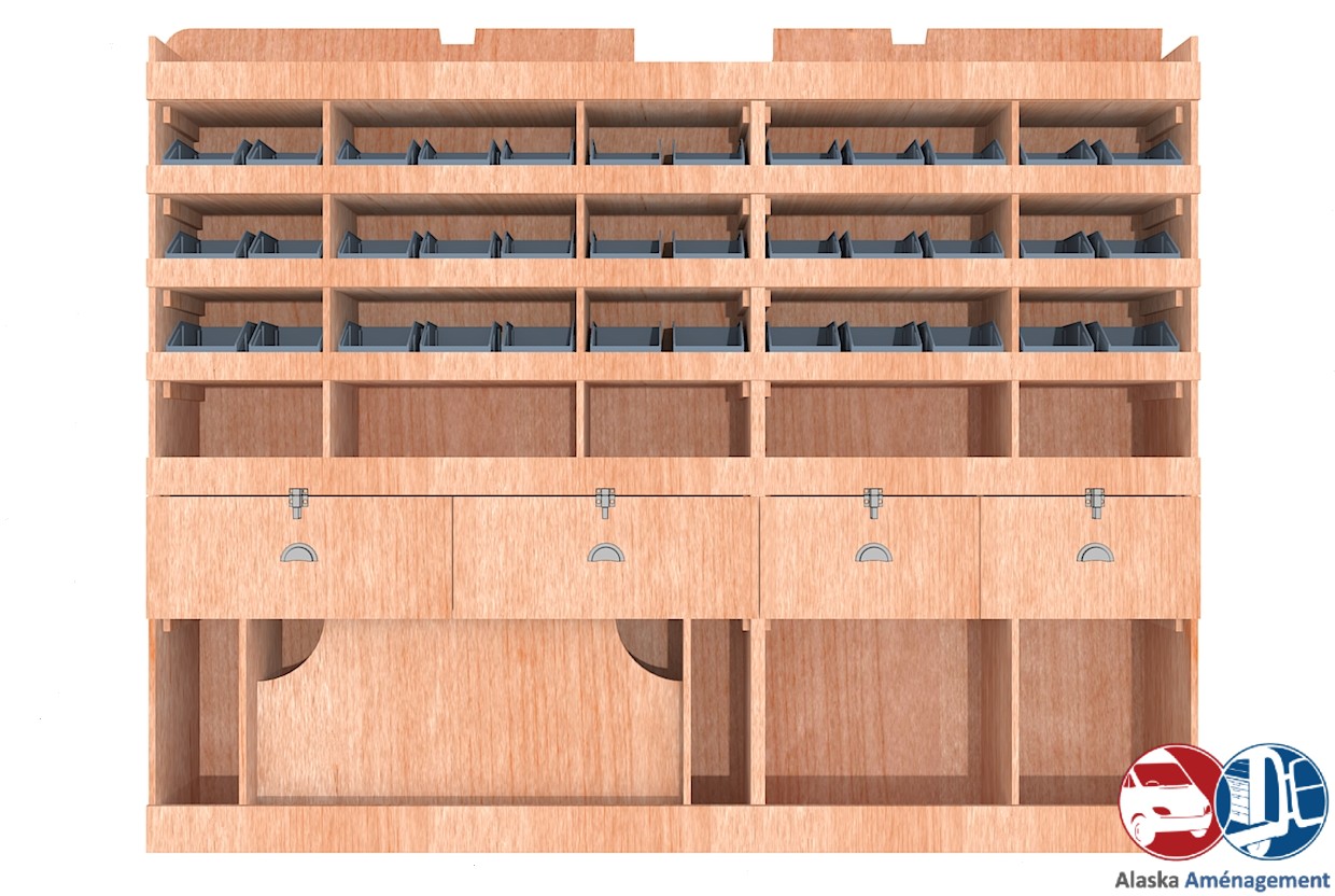 Ce meuble de rangement KRG004-N (pour le latéral « Gauche » de votre véhicule) offre une solution polyvalente et fonctionnelle avec sept niveaux de stockage. Il comprend des étagères pour bacs à bec, une rangée de tiroirs. Une étagère supérieure est conçue pour les objets longs. Son fond arrière intégré assure la rigidité et protège la carrosserie du véhicule, évitant un habillage supplémentaire. Le meuble est disponible en contreplaqué brut ou filmé. |