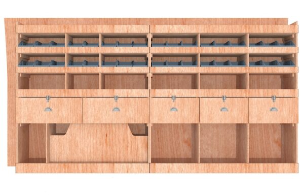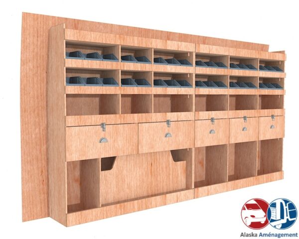 Ce meuble de rangement KRG004-N (pour le latéral « Gauche » de votre véhicule) offre une solution polyvalente et fonctionnelle avec six niveaux de stockage. Il comprend des étagères pour bacs à bec, une rangée de tiroirs. Une étagère supérieure est conçue pour les objets longs. Son fond arrière intégré assure la rigidité et protège la carrosserie du véhicule, évitant un habillage supplémentaire. Le meuble est disponible en contreplaqué brut ou filmé. |