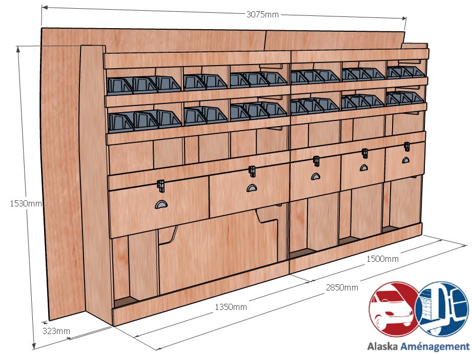 Ce meuble de rangement KRG004-N (pour le latéral « Gauche » de votre véhicule) offre une solution polyvalente et fonctionnelle avec six niveaux de stockage. Il comprend des étagères pour bacs à bec, une rangée de tiroirs. Une étagère supérieure est conçue pour les objets longs. Son fond arrière intégré assure la rigidité et protège la carrosserie du véhicule, évitant un habillage supplémentaire. Le meuble est disponible en contreplaqué brut ou filmé. |