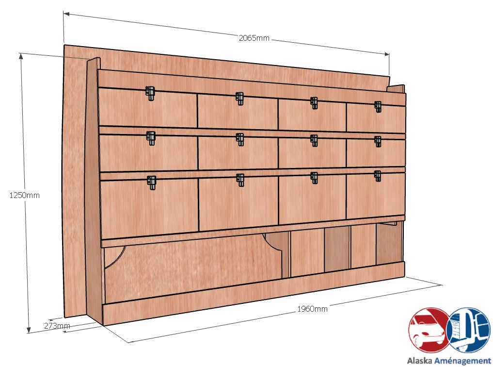 Ce meuble de rangement KRG004-N (pour le latéral « Gauche » de votre véhicule) offre une solution de stockage avec cinq niveaux de stockage. Il comprend trois niveaux de clapets basculants. Une étagère supérieure est conçue pour les objets longs. Son fond arrière intégré assure la rigidité et protège la carrosserie du véhicule, évitant un habillage supplémentaire. Le meuble est disponible en contreplaqué brut ou filmé.