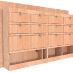Ce meuble de rangement KRG004-N (pour le latéral « Gauche » de votre véhicule) offre une solution de stockage avec cinq niveaux de stockage. Il comprend trois niveaux de clapets basculants. Une étagère supérieure est conçue pour les objets longs. Son fond arrière intégré assure la rigidité et protège la carrosserie du véhicule, évitant un habillage supplémentaire. Le meuble est disponible en contreplaqué brut ou filmé.