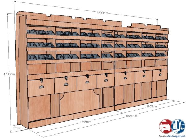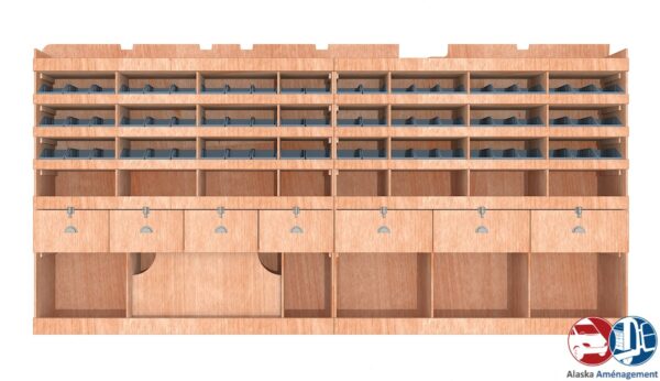 Ce meuble de rangement KRG004-N(pour le latéral « Gauche » de votre véhicule) offre une solution polyvalente et fonctionnelle avec sept niveaux de stockage. Il comprend des étagères pour bacs à bec, une rangée de tiroirs. Une étagère supérieure est conçue pour les objets longs. Son fond arrière intégré assure la rigidité et protège la carrosserie du véhicule, évitant un habillage supplémentaire. Le meuble est disponible en contreplaqué brut ou filmé.