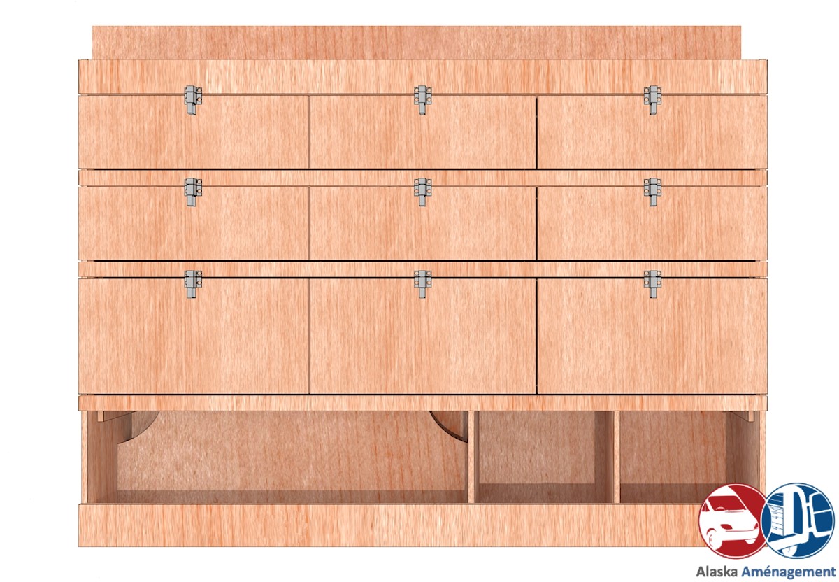 Ce meuble de rangement KRG004-N (pour le latéral « Gauche » de votre véhicule) offre une solution de stockage avec cinq niveaux de stockage. Il comprend trois niveaux de clapets basculants. Une étagère supérieure est conçue pour les objets longs. Son fond arrière intégré assure la rigidité et protège la carrosserie du véhicule, évitant un habillage supplémentaire. Le meuble est disponible en contreplaqué brut ou filmé.