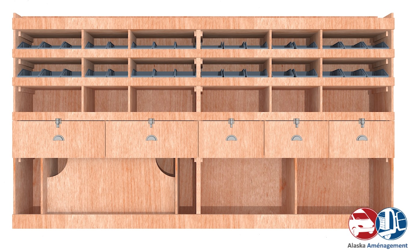 Ce meuble de rangement KRG004-N (pour le latéral « Gauche » de votre véhicule) offre une solution polyvalente et fonctionnelle avec six niveaux de stockage. Il comprend des étagères pour bacs à bec, une rangée de tiroirs. Une étagère supérieure est conçue pour les objets longs. Son fond arrière intégré assure la rigidité et protège la carrosserie du véhicule, évitant un habillage supplémentaire. Le meuble est disponible en contreplaqué brut ou filmé.