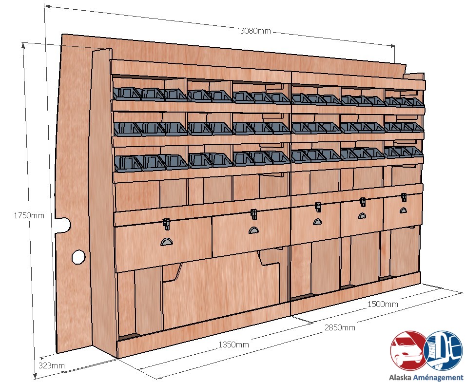 Ce meuble de rangement KRG004-N (pour le latéral « Gauche » de votre véhicule) offre une solution polyvalente et fonctionnelle avec sept niveaux de stockage. Il comprend des étagères pour bacs à bec, une rangée de tiroirs. Une étagère supérieure est conçue pour les objets longs. Son fond arrière intégré assure la rigidité et protège la carrosserie du véhicule, évitant un habillage supplémentaire. Le meuble est disponible en contreplaqué brut ou filmé. |