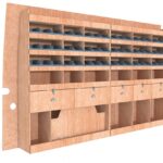 | Meuble structuré avec tiroirs, étagères avec bacs à bec, conçu pour un rangement précis et organisé.