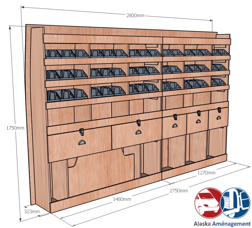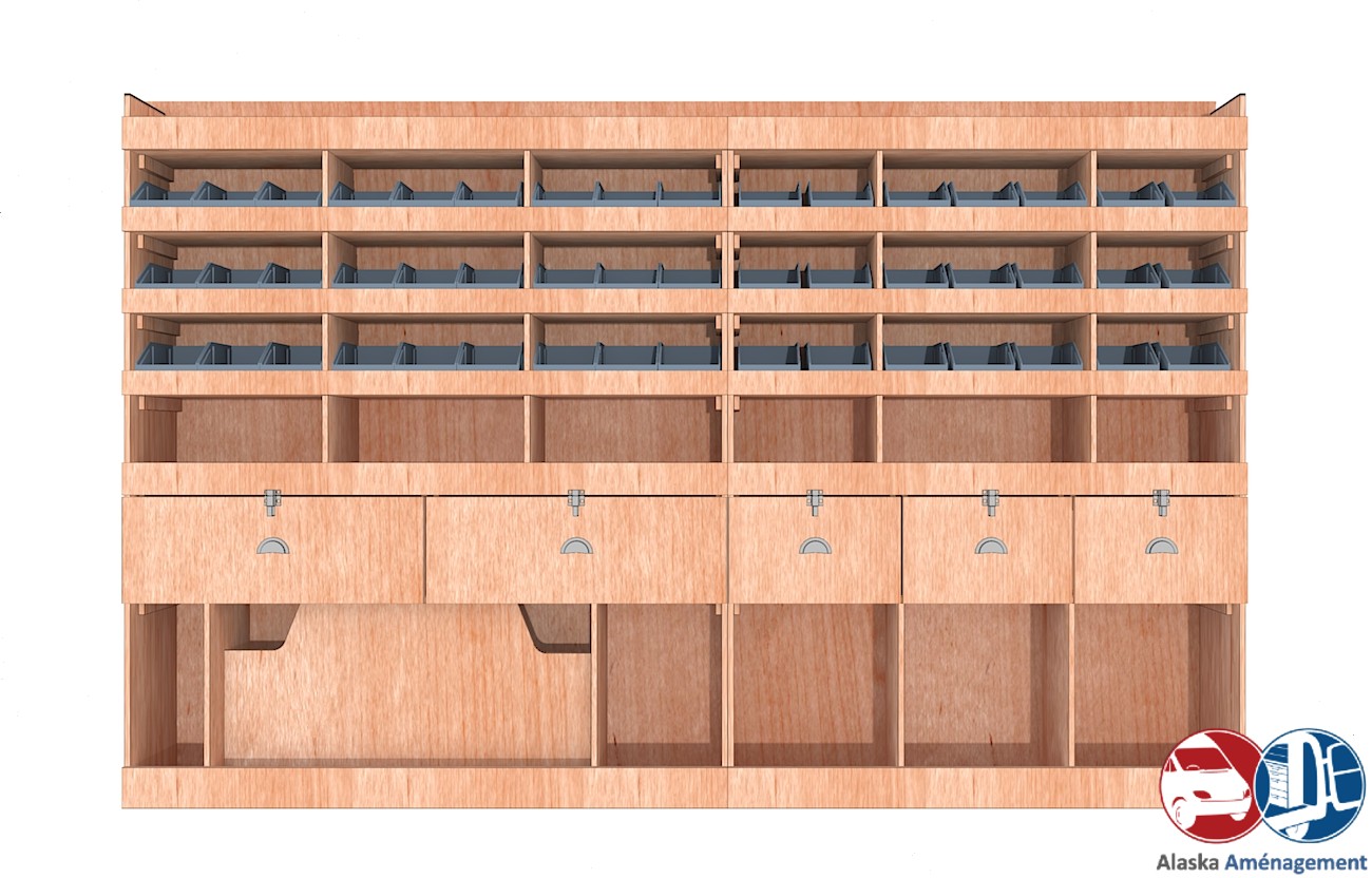 Ce meuble de rangement KRG004-N (pour le latéral « Gauche » de votre véhicule) offre une solution polyvalente et fonctionnelle avec sept niveaux de stockage. Il comprend des étagères pour bacs à bec, une rangée de tiroirs. Une étagère supérieure est conçue pour les objets longs. Son fond arrière intégré assure la rigidité et protège la carrosserie du véhicule, évitant un habillage supplémentaire. Le meuble est disponible en contreplaqué brut ou filmé.