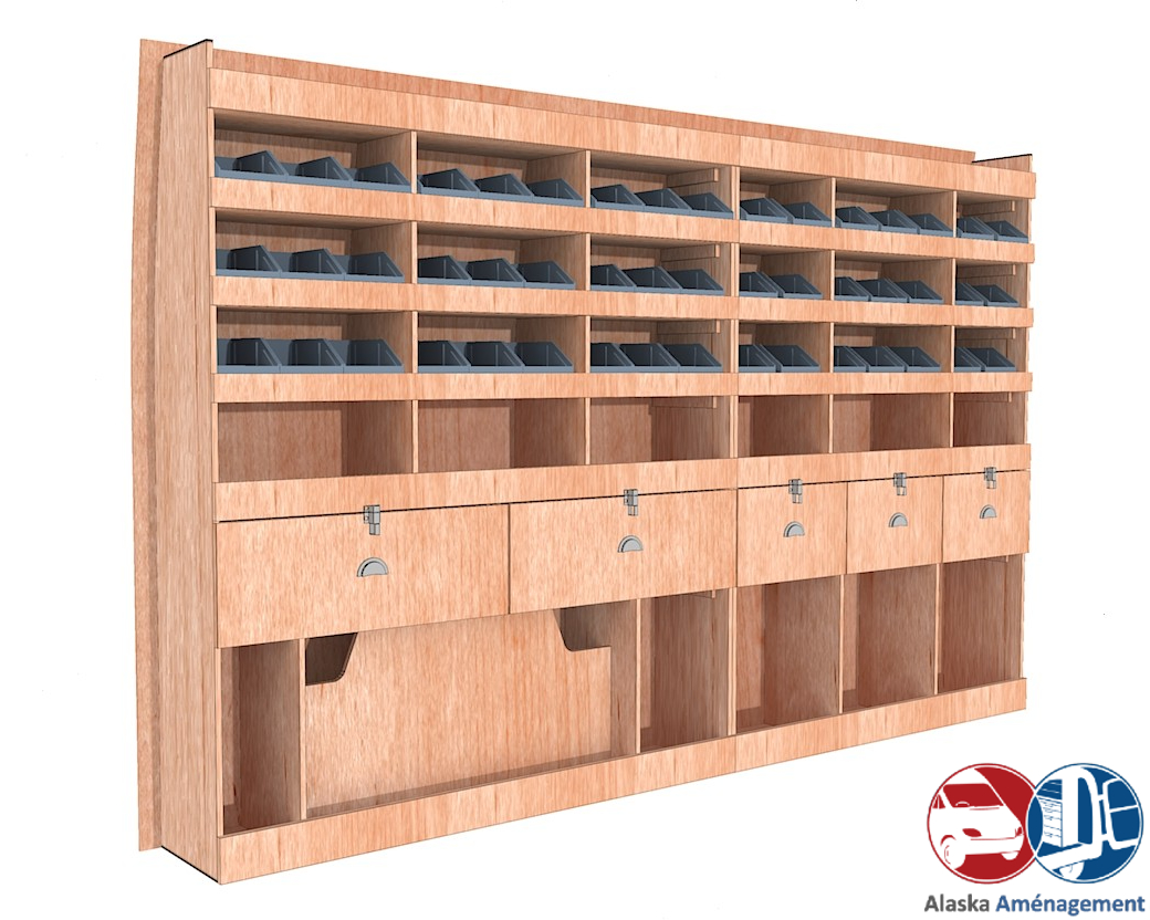 Ce meuble de rangement KRG004-N(pour le latéral « Gauche » de votre véhicule) offre une solution polyvalente et fonctionnelle avec sept niveaux de stockage. Il comprend des étagères pour bacs à bec, une rangée de tiroirs. Une étagère supérieure est conçue pour les objets longs. Son fond arrière intégré assure la rigidité et protège la carrosserie du véhicule, évitant un habillage supplémentaire. Le meuble est disponible en contreplaqué brut ou filmé.