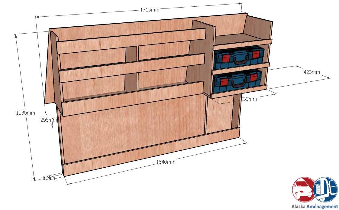 • Module pour Électroportatif : Un module vertical dédié au rangement de vos mallettes d’outils (type Festool Systainer, Makita, Facom etc.). Des rebords de maintien assurent une stabilité parfaite pendant le transport.