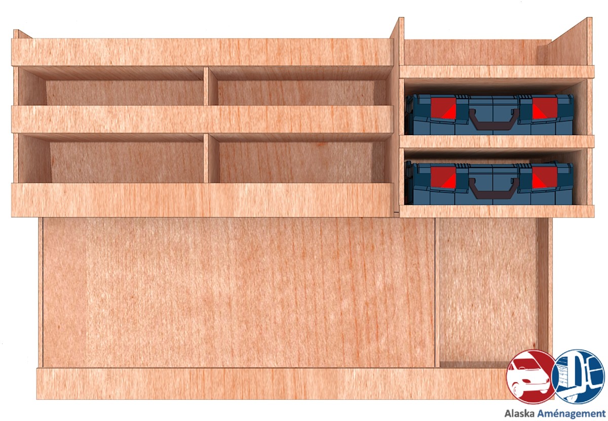 Ce meuble de rangement KRMG-DC-N (pour le latéral « Gauche » de votre véhicule) offre une solution de stockage polyvalente et fonctionnelle avec trois niveaux de stockage. Il comprend des étagères  et un module spécifique pour les mallettes d’électroportatif. Son fond arrière intégré et sa protection de passage de roue assurent la rigidité et protège la carrosserie du véhicule, évitant un habillage supplémentaire. Le meuble est disponible en contreplaqué brut ou filmé.