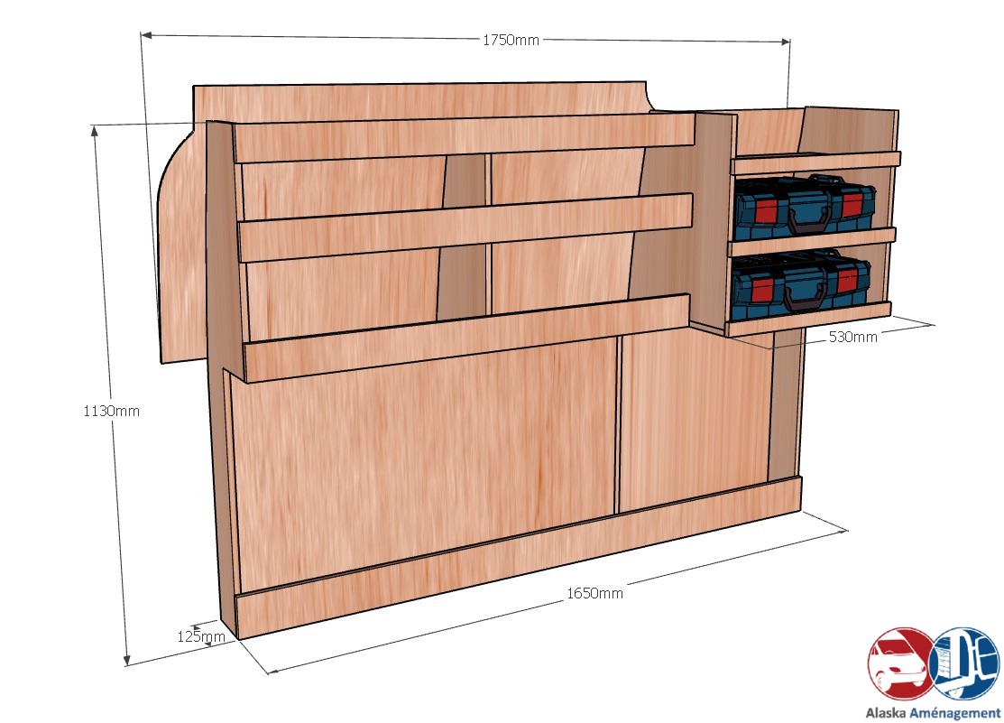 Ce meuble de rangement KRMG-DC-N (pour le latéral « Gauche » de votre véhicule) offre une solution de stockage polyvalente et fonctionnelle avec trois niveaux de stockage. Il comprend des étagères  et un module spécifique pour les mallettes d’électroportatif. Son fond arrière intégré et sa protection de passage de roue assurent la rigidité et protège la carrosserie du véhicule, évitant un habillage supplémentaire. Le meuble est disponible en contreplaqué brut ou filmé.