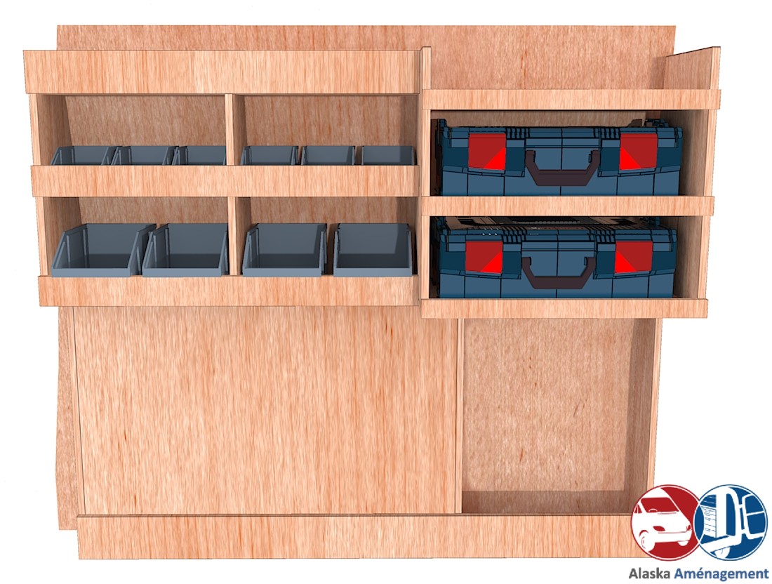 Ce meuble de rangement KRMG-DC001-N (pour le latéral « Gauche » de votre véhicule) offre une solution de stockage polyvalente et fonctionnelle avec trois niveaux de stockage. Il comprend des étagères équipés de bacs à becs et un module spécifique pour les mallettes d’électroportatif. Son fond arrière intégré et sa protection de passage de roue assurent la rigidité et protège la carrosserie du véhicule, évitant un habillage supplémentaire. Le meuble est disponible en contreplaqué brut ou filmé.