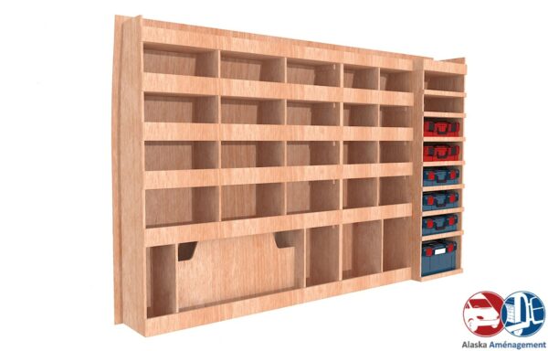 Ce meuble de rangement KRMG-N (pour le latéral « Gauche » de votre véhicule) offre une solution de stockage polyvalente et fonctionnelle avec six niveaux de stockage. Il comprend des étagères  et un module spécifique pour les mallettes d’électroportatif. Une étagère supérieure est conçue pour les objets longs. Son fond arrière intégré assure la rigidité et protège la carrosserie du véhicule, évitant un habillage supplémentaire. Le meuble est disponible en contreplaqué brut ou filmé.