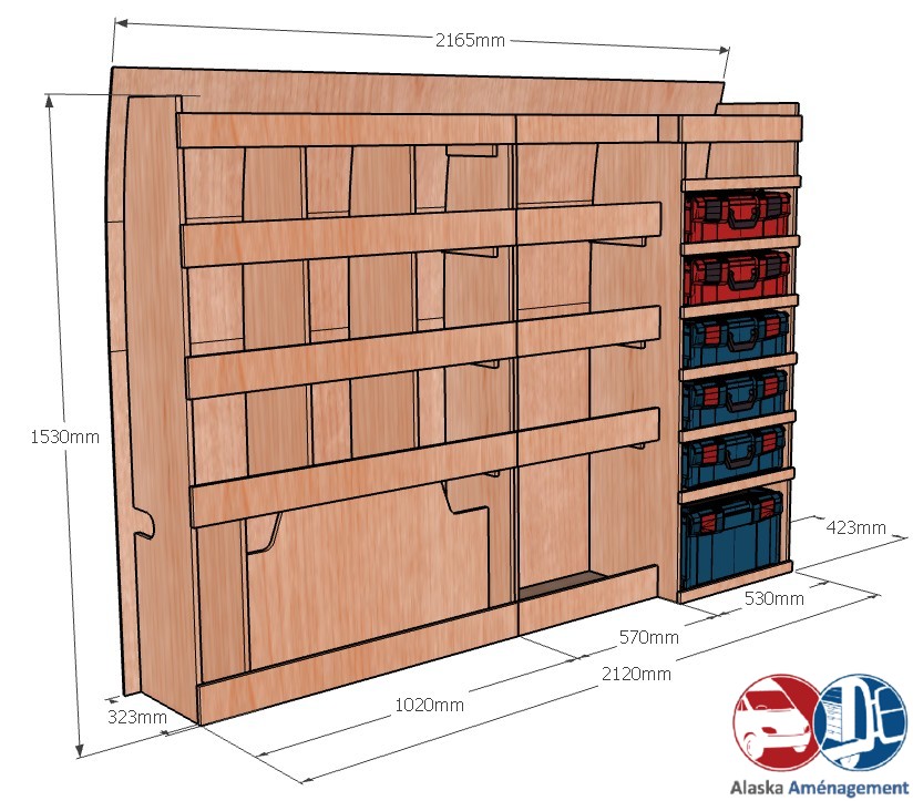 Ce meuble de rangement KRMG-N (pour le latéral « Gauche » de votre véhicule) offre une solution de stockage polyvalente et fonctionnelle avec cinq niveaux de stockage. Il comprend des étagères et un module spécifique pour les mallettes d’électroportatif. Une étagère supérieure est conçue pour les objets longs. Son fond arrière intégré assure la rigidité et protège la carrosserie du véhicule, évitant un habillage supplémentaire. Le meuble est disponible en contreplaqué brut ou filmé. |