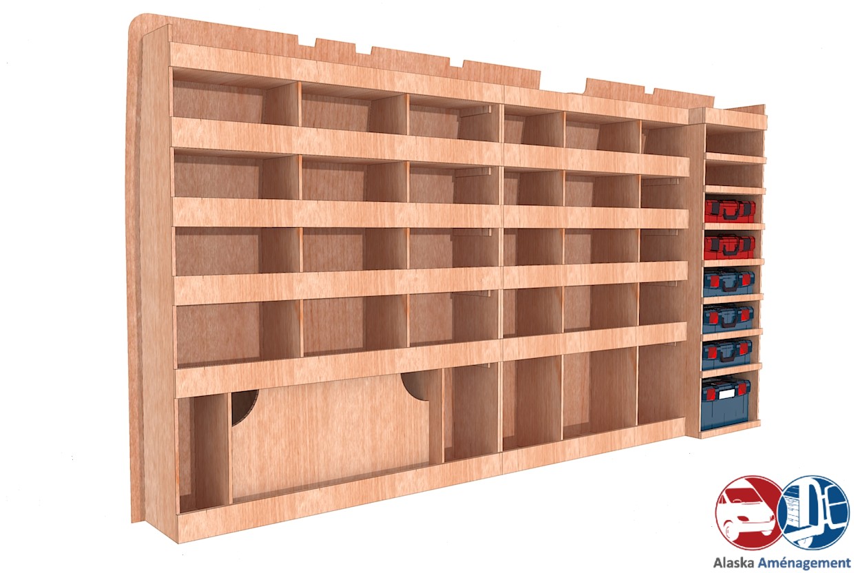 Ce meuble de rangement KRMG-N (pour le latéral « Gauche » de votre véhicule) offre une solution de stockage polyvalente et fonctionnelle avec six niveaux de stockage. Il comprend des étagères  et un module spécifique pour les mallettes d’électroportatif. Une étagère supérieure est conçue pour les objets longs. Son fond arrière intégré assure la rigidité et protège la carrosserie du véhicule, évitant un habillage supplémentaire. Le meuble est disponible en contreplaqué brut ou filmé.