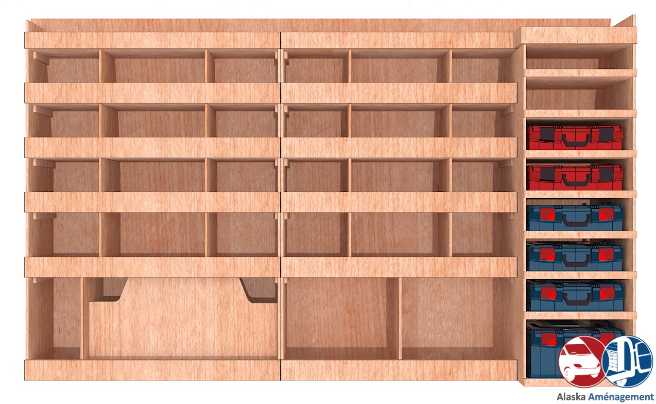 Ce meuble de rangement KRMG-N (pour le latéral « Gauche » de votre véhicule) offre une solution de stockage polyvalente et fonctionnelle avec six niveaux de stockage. Il comprend des étagères  et un module spécifique pour les mallettes d’électroportatif. Une étagère supérieure est conçue pour les objets longs. Son fond arrière intégré assure la rigidité et protège la carrosserie du véhicule, évitant un habillage supplémentaire. Le meuble est disponible en contreplaqué brut ou filmé.