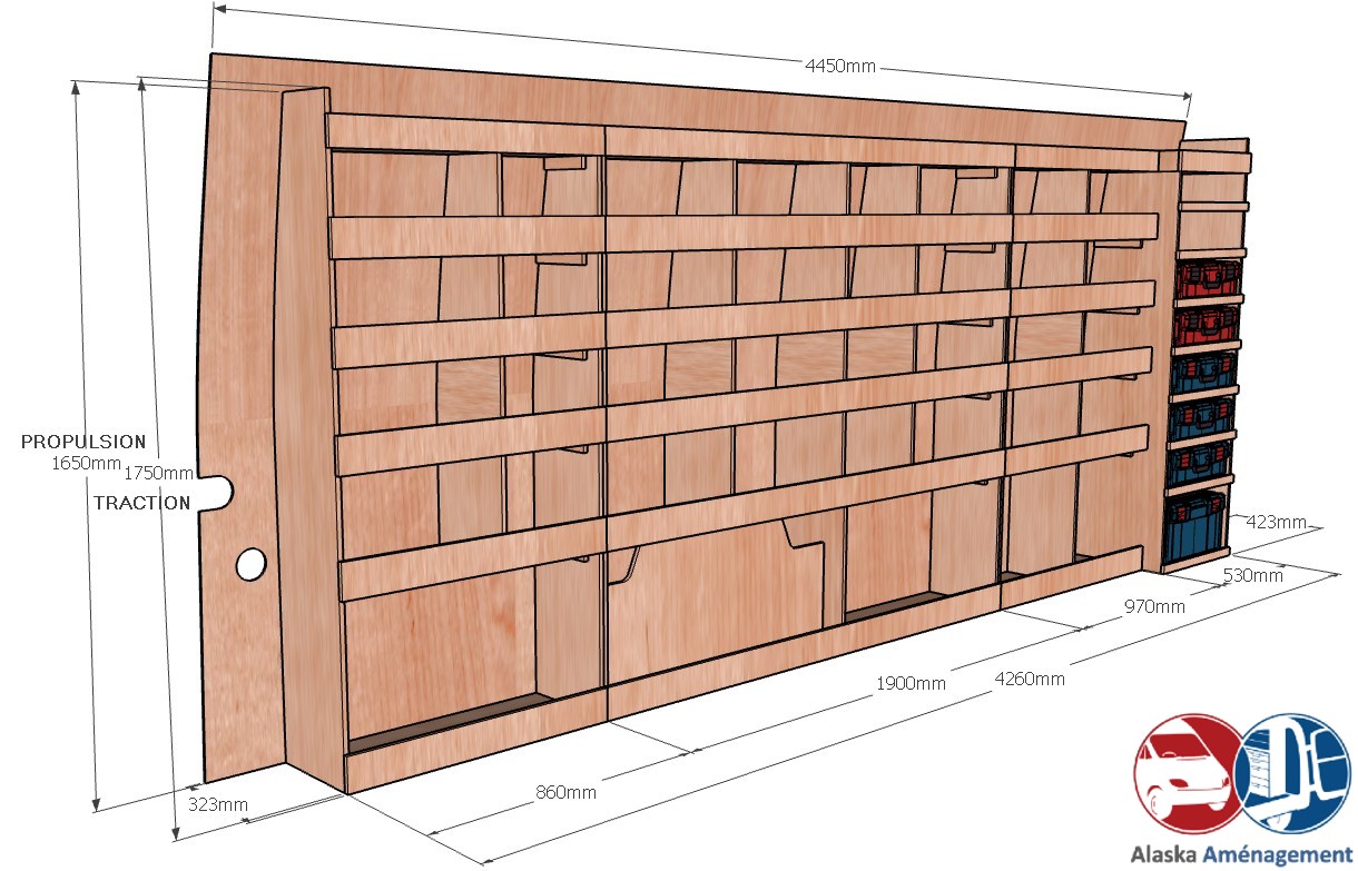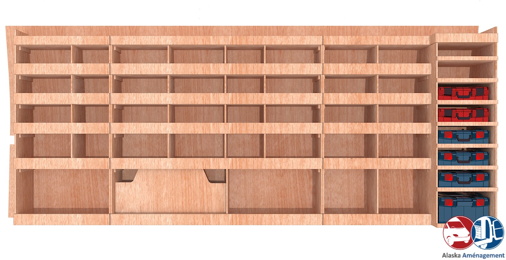 Ce meuble de rangement KRMG-N (pour le latéral « Gauche » de votre véhicule) offre une solution de stockage polyvalente et fonctionnelle avec six niveaux de stockage. Il comprend des étagères et un module spécifique pour les mallettes d’électroportatif. Une étagère supérieure est conçue pour les objets longs. Son fond arrière intégré assure la rigidité et protège la carrosserie du véhicule, évitant un habillage supplémentaire. Le meuble est disponible en contreplaqué brut ou filmé. |