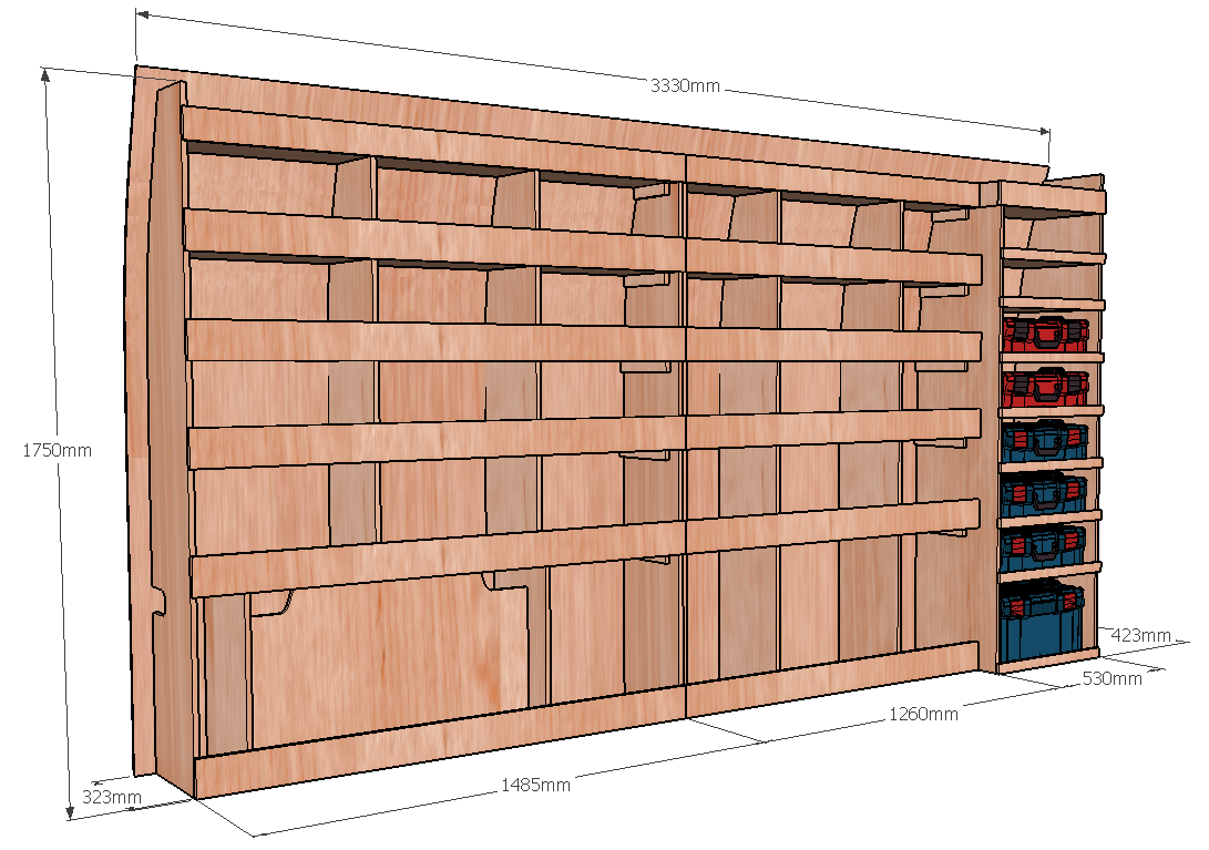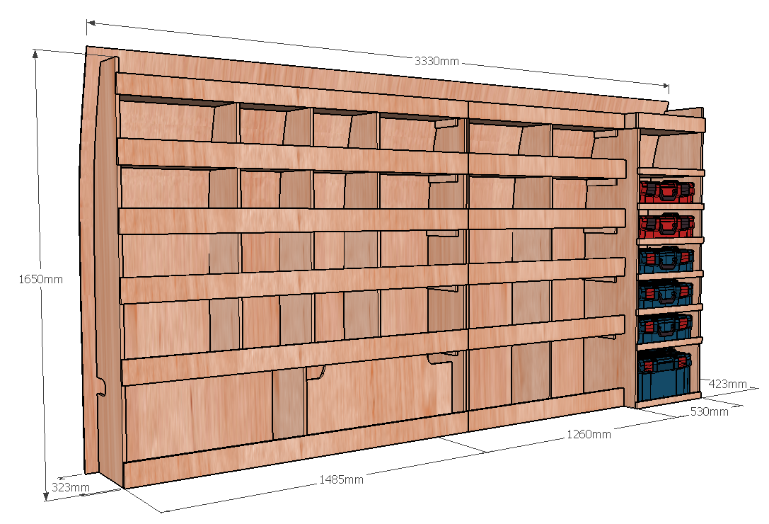 • Module pour Électroportatif : Un module vertical dédié au rangement de vos mallettes d’outils (type Festool Systainer, Makita, Facom etc.). Des rebords de maintien assurent une stabilité parfaite pendant le transport.