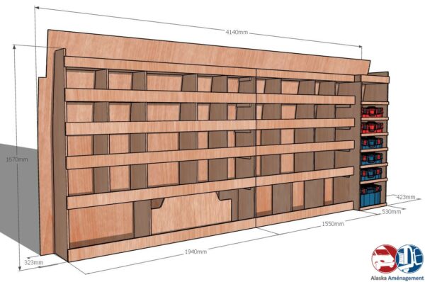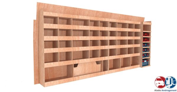 Ce meuble de rangement KRMG-N (pour le latéral « Gauche » de votre véhicule) offre une solution de stockage polyvalente et fonctionnelle avec six niveaux de stockage. Il comprend des étagères  et un module spécifique pour les mallettes d’électroportatif. Une étagère supérieure est conçue pour les objets longs. Son fond arrière intégré assure la rigidité et protège la carrosserie du véhicule, évitant un habillage supplémentaire. Le meuble est disponible en contreplaqué brut ou filmé.
