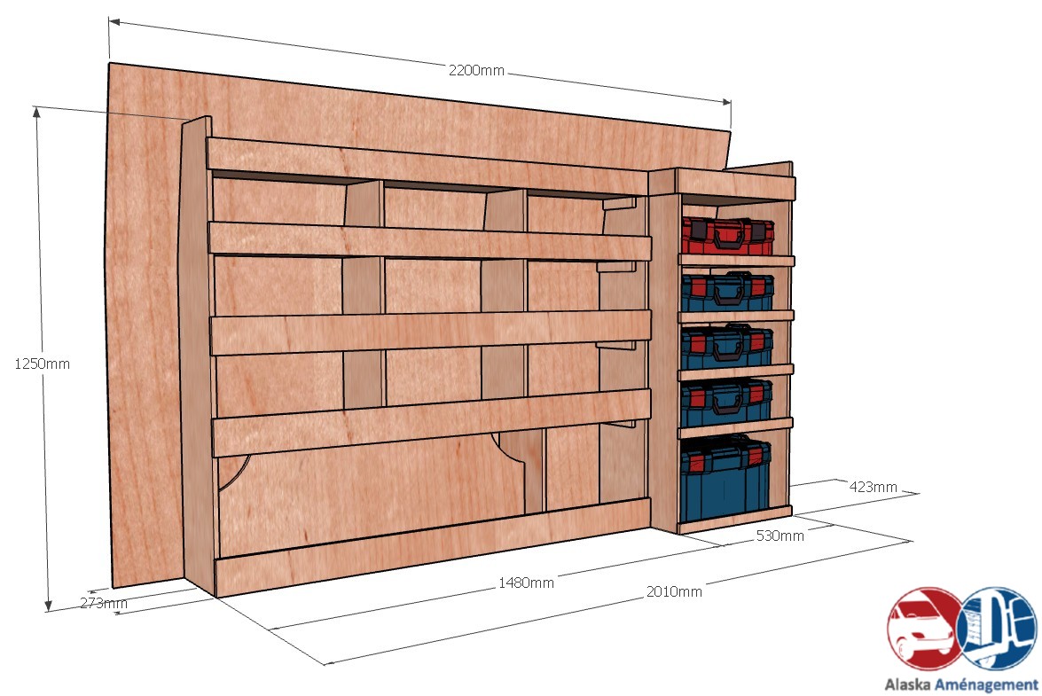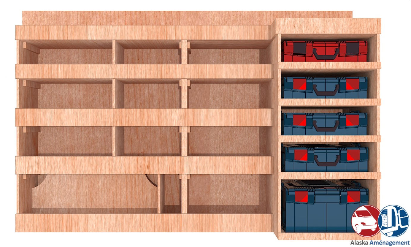 Ce meuble de rangement KRMG-N (pour le latéral « Gauche » de votre véhicule) offre une solution de stockage polyvalente et fonctionnelle avec cinq niveaux de stockage. Il comprend des étagères et un module spécifique pour les mallettes d’électroportatif. Une étagère supérieure est conçue pour les objets longs. Son fond arrière intégré assure la rigidité et protège la carrosserie du véhicule, évitant un habillage supplémentaire. Le meuble est disponible en contreplaqué brut ou filmé. |