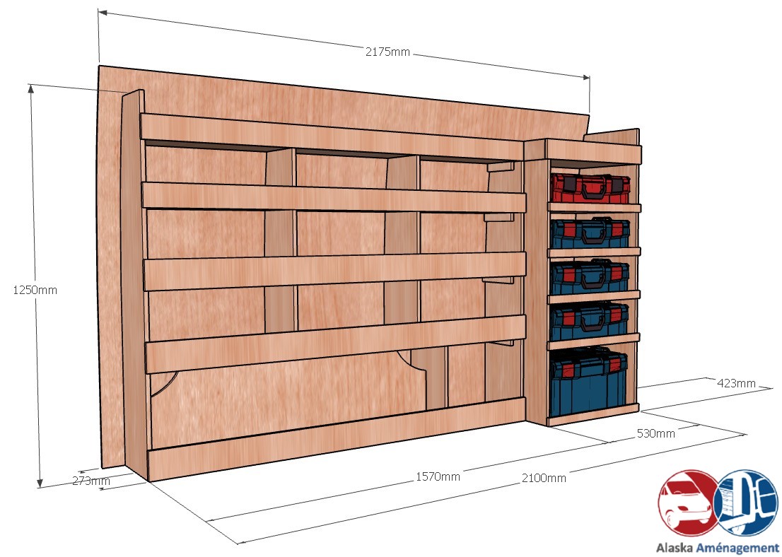 Ce meuble de rangement KRMG-N (pour le latéral « Gauche » de votre véhicule) offre une solution de stockage polyvalente et fonctionnelle avec cinq niveaux de stockage. Il comprend des étagères et un module spécifique pour les mallettes d’électroportatif. Une étagère supérieure est conçue pour les objets longs. Son fond arrière intégré assure la rigidité et protège la carrosserie du véhicule, évitant un habillage supplémentaire. Le meuble est disponible en contreplaqué brut ou filmé. |