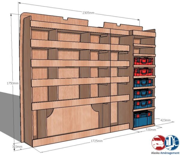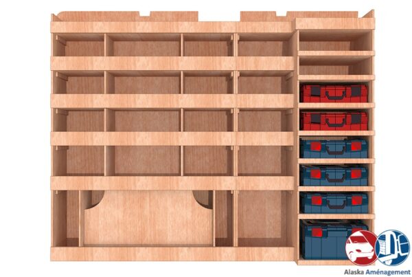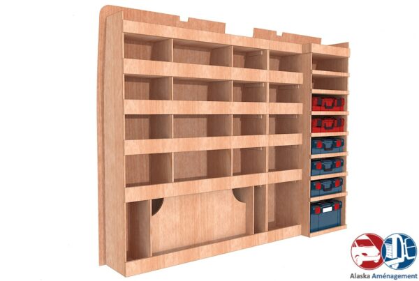 Ce meuble de rangement KRMG-N(pour le latéral « Gauche » de votre véhicule) offre une solution de stockage polyvalente et fonctionnelle avec cinq niveaux de stockage. Il comprend des étagères et un module spécifique pour les mallettes d’électroportatif. Une étagère supérieure est conçue pour les objets longs. Son fond arrière intégré assure la rigidité et protège la carrosserie du véhicule, évitant un habillage supplémentaire. Le meuble est disponible en contreplaqué brut ou filmé.