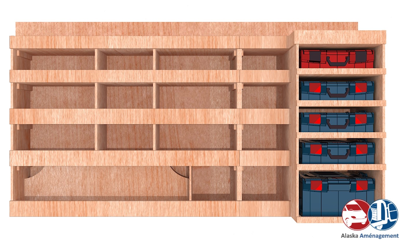 Ce meuble de rangement KRMG-N (pour le latéral « Gauche » de votre véhicule) offre une solution de stockage polyvalente et fonctionnelle avec cinq niveaux de stockage. Il comprend des étagères  et un module spécifique pour les mallettes d’électroportatif. Une étagère supérieure est conçue pour les objets longs. Son fond arrière intégré assure la rigidité et protège la carrosserie du véhicule, évitant un habillage supplémentaire. Le meuble est disponible en contreplaqué brut ou filmé.