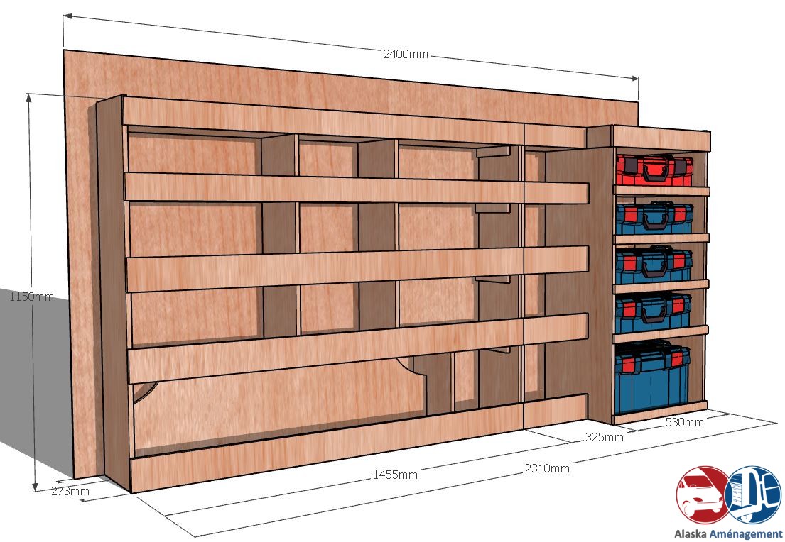 • Module pour Électroportatif : Un module vertical dédié au rangement de vos mallettes d’outils (type Festool Systainer, Makita, Facom etc.). Des rebords de maintien assurent une stabilité parfaite pendant le transport.
