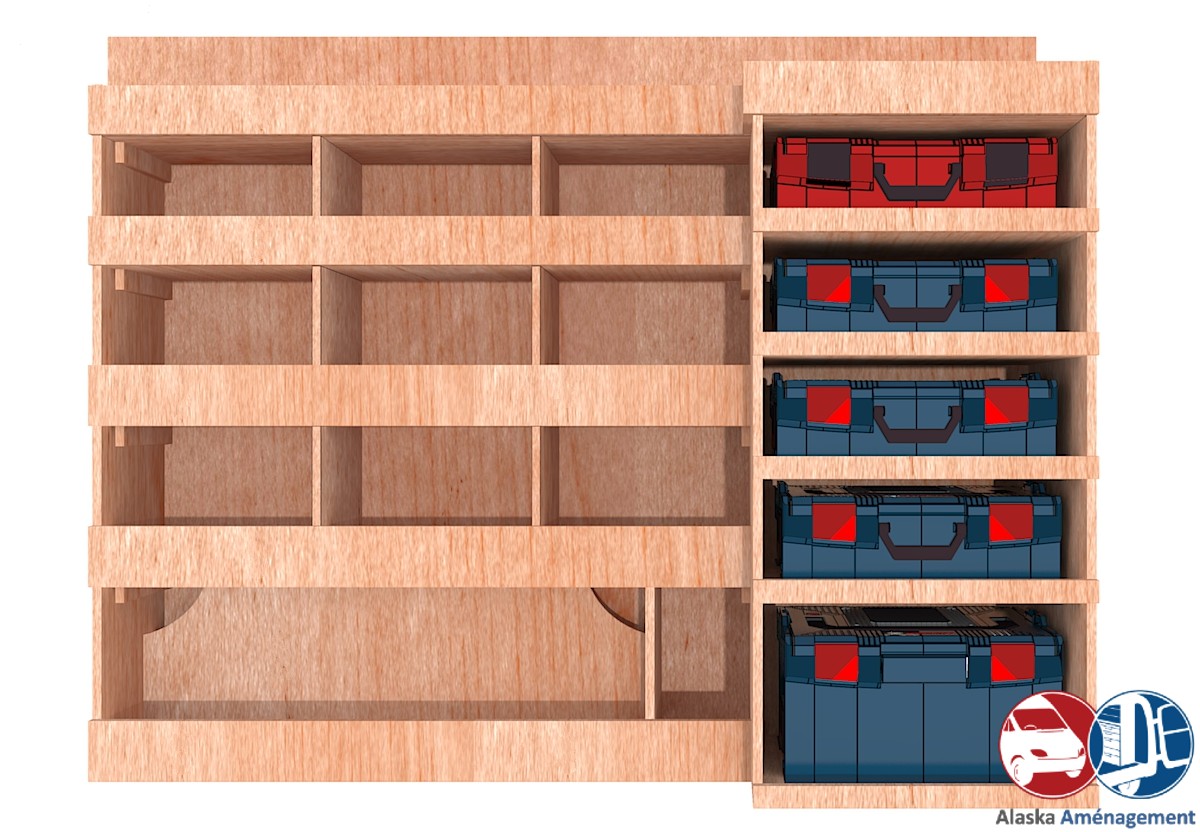 Ce meuble de rangement KRMG-N (pour le latéral « Gauche » de votre véhicule) offre une solution de stockage polyvalente et fonctionnelle avec cinq niveaux de stockage. Il comprend des étagères et un module spécifique pour les mallettes d’électroportatif. Une étagère supérieure est conçue pour les objets longs. Son fond arrière intégré assure la rigidité et protège la carrosserie du véhicule, évitant un habillage supplémentaire. Le meuble est disponible en contreplaqué brut ou filmé. |