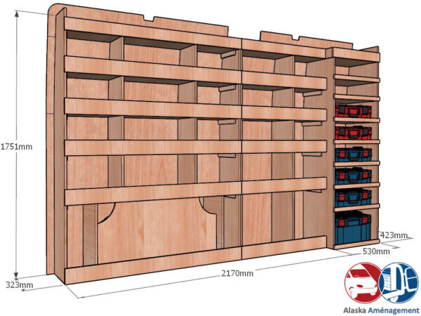 Ce meuble de rangement KRMG-N(pour le latéral « Gauche » de votre véhicule) offre une solution de stockage polyvalente et fonctionnelle avec six niveaux de stockage. Il comprend des étagères et un module spécifique pour les mallettes d’électroportatif. Une étagère supérieure est conçue pour les objets longs. Son fond arrière intégré assure la rigidité et protège la carrosserie du véhicule, évitant un habillage supplémentaire. Le meuble est disponible en contreplaqué brut ou filmé.
