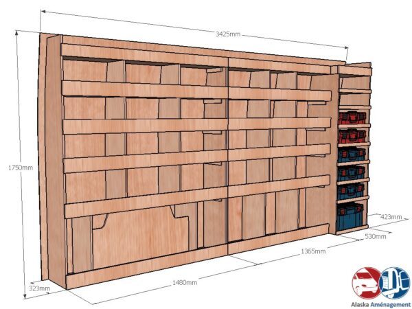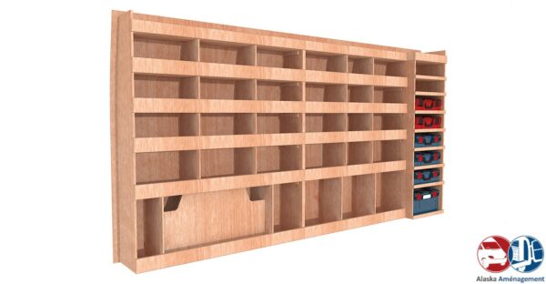 Ce meuble de rangement KRMG-N(pour le latéral « Gauche » de votre véhicule) offre une solution de stockage polyvalente et fonctionnelle avec six niveaux de stockage. Il comprend des étagères et un module spécifique pour les mallettes d’électroportatif. Une étagère supérieure est conçue pour les objets longs. Son fond arrière intégré assure la rigidité et protège la carrosserie du véhicule, évitant un habillage supplémentaire. Le meuble est disponible en contreplaqué brut ou filmé.